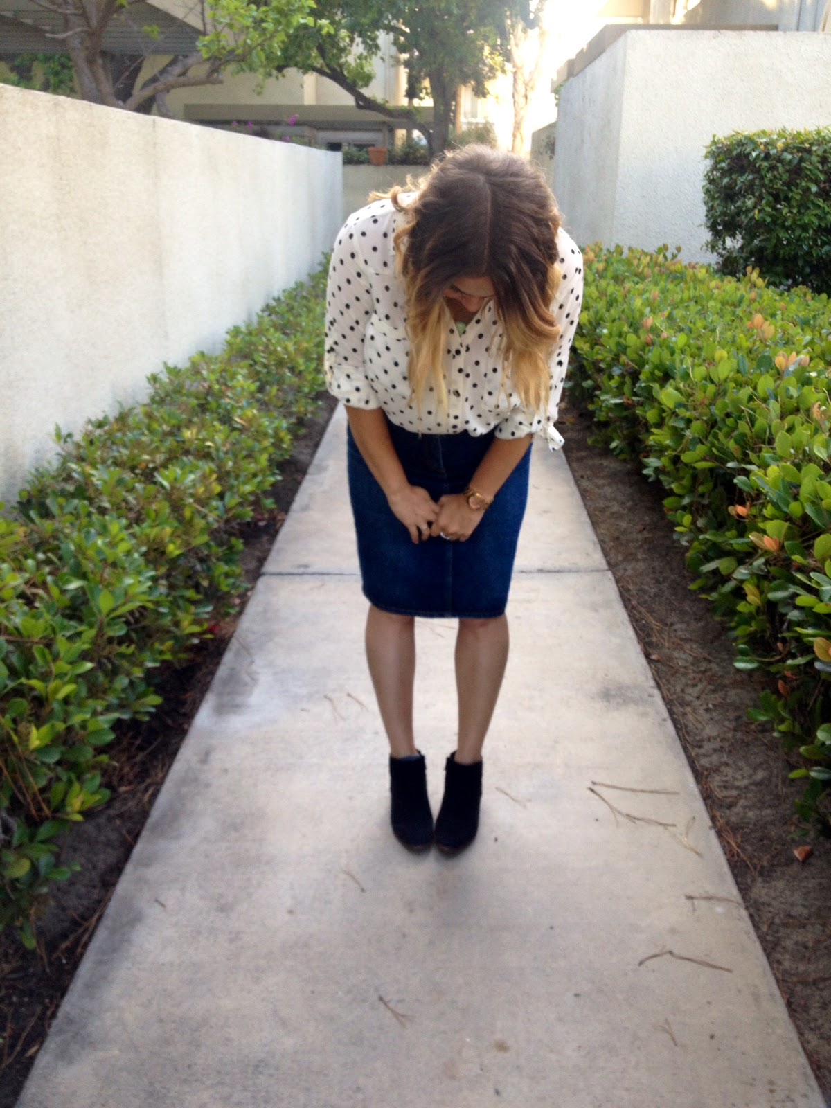 On a recent trip to the mall (I kind of feel like an 11-year-old and/or a Canadian pop star saying I went on a trip to the mall), I kind of fell in love with the Portofino blouses at Express. They were on sale, so it's a wonder I didn't walk off with the entire collection of prints… I settled for a couple (and then a couple more online…), one being this perfect polka dot print! Then I found this denim pencil skirt in my mom's closet (everything old is new again!) and I had the perfect, teacher-y outfit to wear to work!